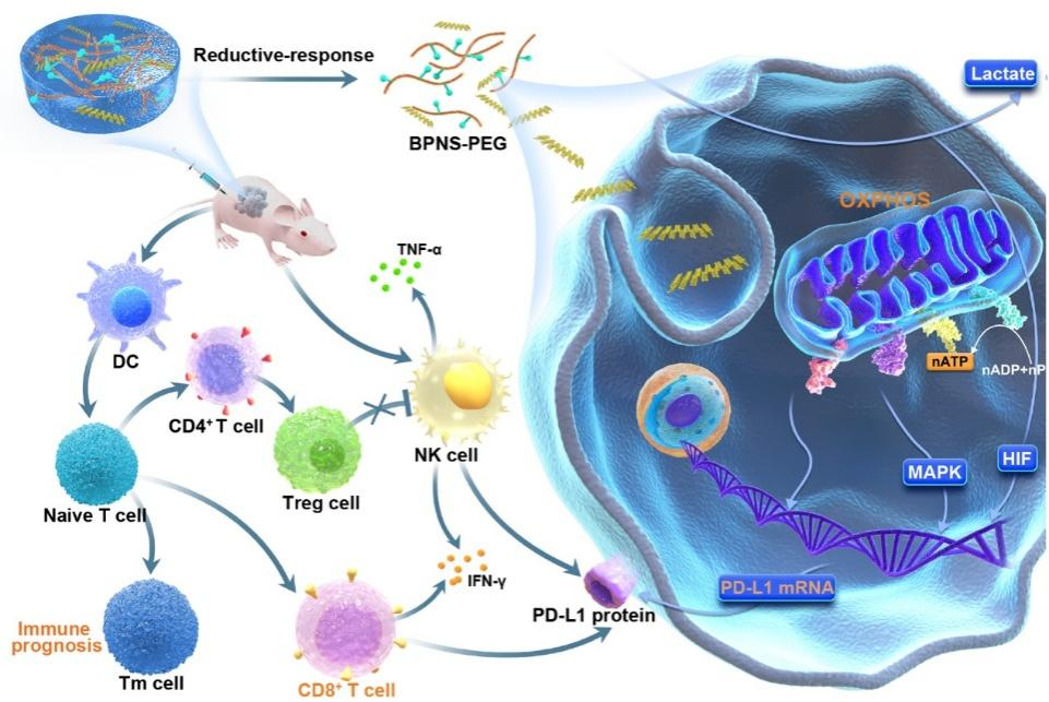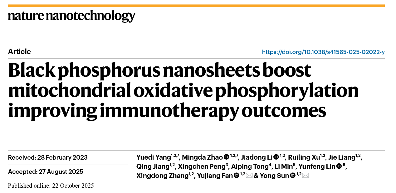 10月22日,beat365中国官方网站生物医学工程学院/国家生物医学材料工程技术研究中心樊渝江教授和孙勇研究员在Nature Nanotechnology上发表题为“Black phosphorus nanosheets boost mitochondrial oxidative phosphorylation improving immunotherapy outcomes”的研究论文,揭示黑磷纳米片通过大幅增强线粒体氧化磷酸化逆转肿瘤细胞固有的糖酵解代谢方式,抑制肿瘤增殖的同时激活免疫,为肿瘤免疫治疗带来新思路。