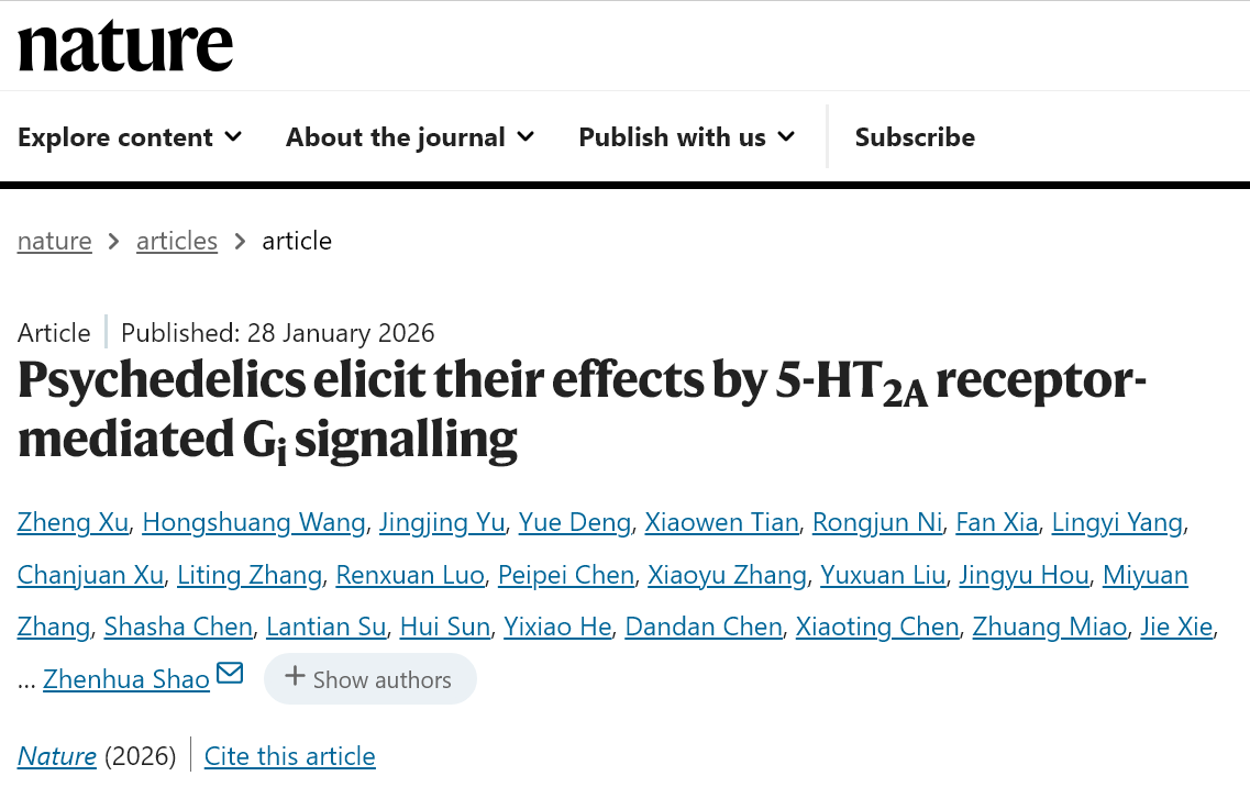 1月28日,四川大学华西医院生物治疗全国重点实验室邵振华/颜微团队联合杨胜勇团队,与中国科学院长春应用化学研究所王晓辉团队、华中科技大学刘剑峰团队合作,在Nature杂志上发表题为“Psychedelics elicit their effects by 5-HT2A receptor-mediated Gi signaling”的最新研究论文。该研究揭示了5-羟色胺2A受体(5-HT2AR)介导的非经典Gi信号通路的新机制,开发出具有潜在转化价值的新型抗抑郁候选药物,为相关精神疾病治疗策略的创新提供了重要依据。四川大学华西医院为本论文第一作者单位和第一通讯作者单位;邵振华研究员、颜微研究员,王晓辉研究员、刘剑峰教授以及杨胜勇教授为共同通讯作者;四川大学华西医院生物治疗研究中心研究员徐政,生物治疗全国重点实验室博士研究生于靖靖、邓悦、田孝文、杨苓艺,博士后张丽婷,四川大学华西医院倪荣军、夏凡为文章的共同第一作者。四川大学华西医院唐向东教授、田肖和教授、柯博文教授,四川大学华西第二医院张伶俐教授、曾力楠教授为此项研究提供了重要帮助。