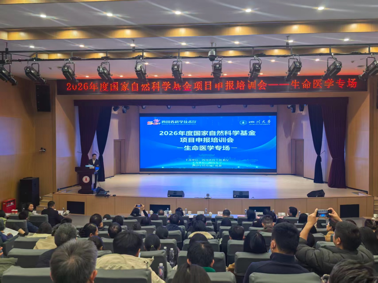 由四川省科学技术厅主办、beat365中国官方网站承办的“2026年度国家自然科学基金项目申报—生命医学专场培训会”于12月3日在望江校区举行,科学技术厅党组书记、厅长路松明,四川大学常务副校长褚良银出席会议。省内30余家生命医学领域科研单位科研管理人员及科研人员代表700余人,通过线上线下相结合的方式参加培训。